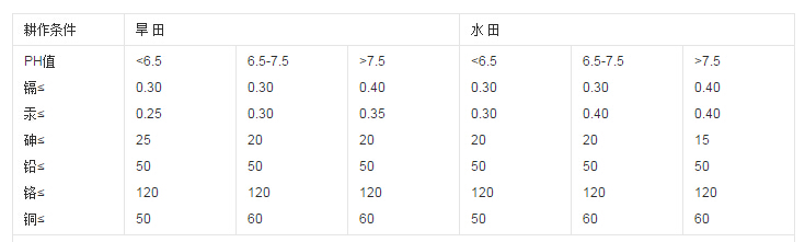 綠色食品產(chǎn)地各種不同土壤中的各項(xiàng)污染物含量不應(yīng)超過(guò)下列表中的限值: